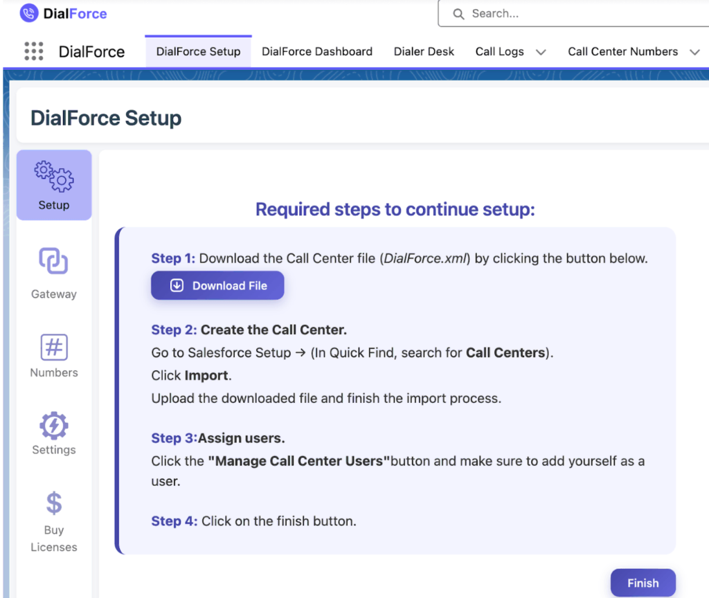 - After switching the DialForce app the default tab Dialforce Setup will be open and continue the steps as follows.