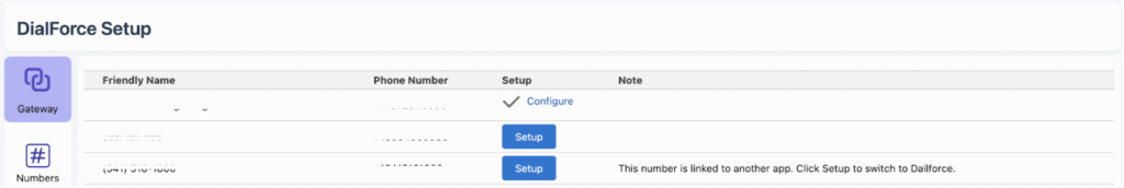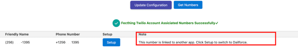 Note: If you are using your existing Twilio account and it already has a number configured for another purpose or system, you will see the message below. When you click Setup, the old configurations will be erased. The DialForce setup will only make changes to the numbers you select for setup, and existing numbers will remain untouched unless you explicitly configure them.