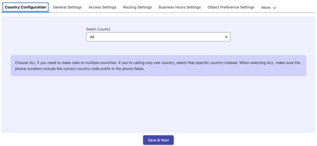 This setting helps automatically append the country code prefix to phone numbers without altering the numbers stored in Salesforce records. If you select “All,” you must either choose the country each time or ensure that phone numbers already include the country prefix at the record level.