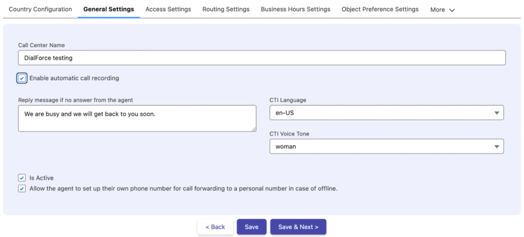 Efficient number configuration is a cornerstone of DialForce’s calling functionality within Salesforce. The Numbers tab offers several options to customize like country selection, access settings, business hours, busy messages & many more. This process takes 2 to 5 minutes.