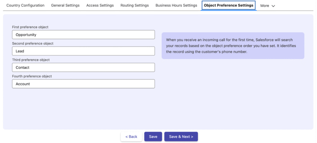 This setting helps when receiving an incoming call for the first time, meaning there is no prior outbound record. In this case, the system will search your records by phone number in the order you define below. For example, if your first preference is Contact and your second is Lead, it will search the Contact records first, and if not found, it will then search the Lead records. You can configure up to four objects in this order.