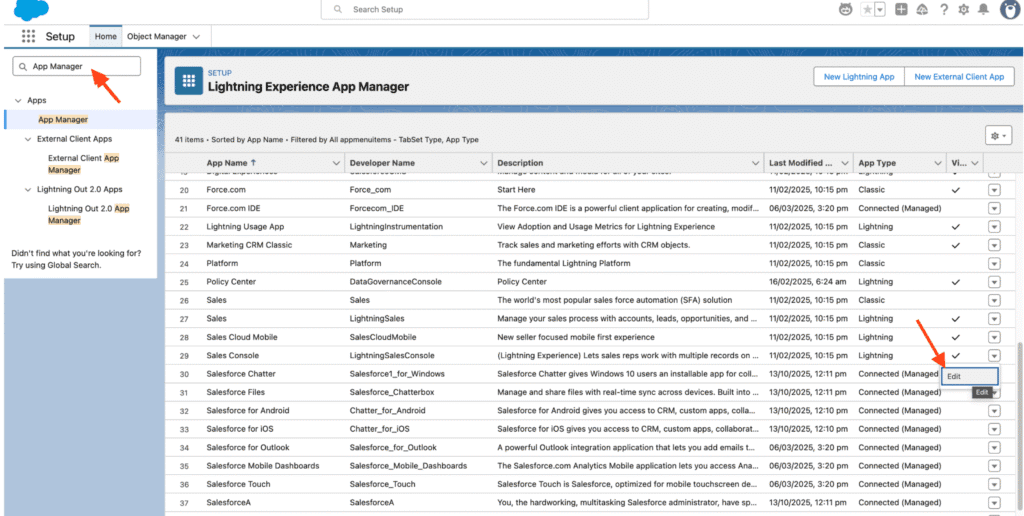 Step 1: Go to Setup → In the Quick Find box, search for “App Manager.”