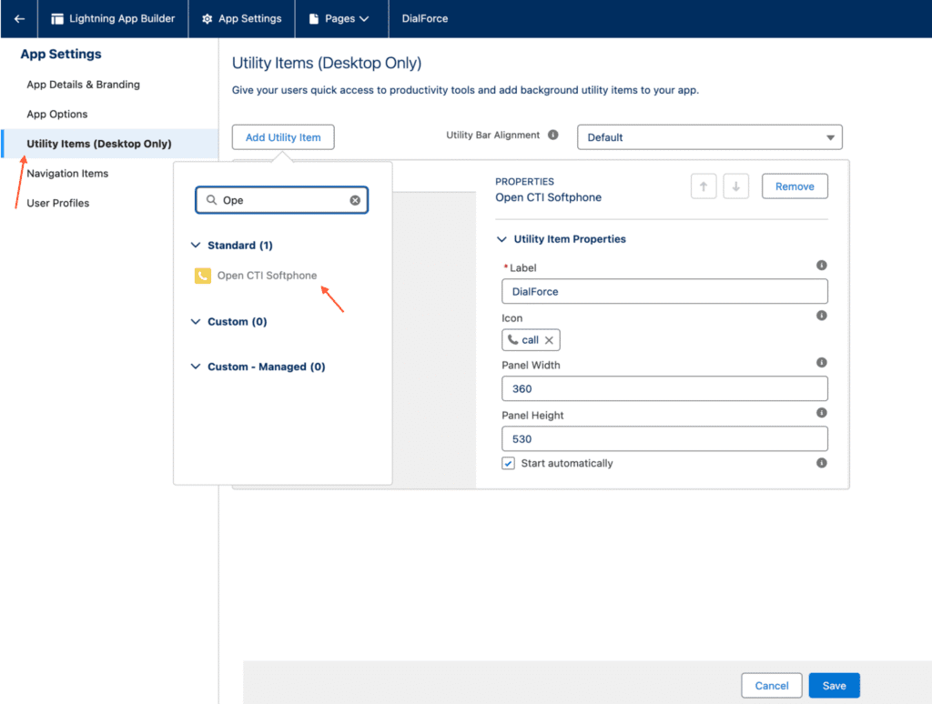 Step 3: In the Utility Items tab, click Add Utility Item and select “Open CTI Softphone.”