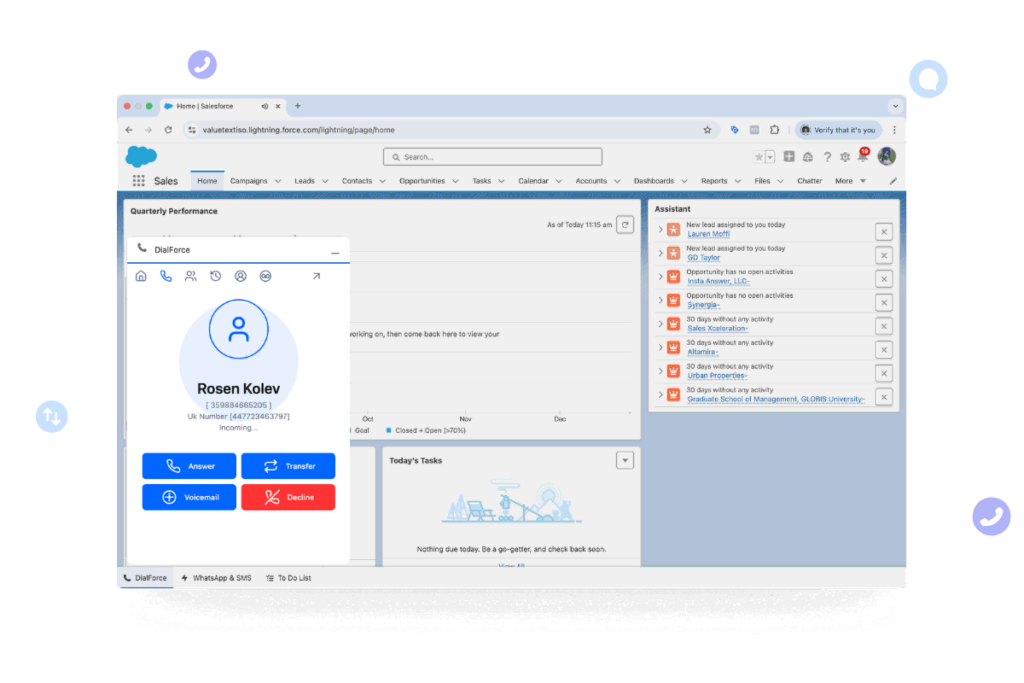 With DialForce, calls initiated in WhatsApp flow directly into Salesforce. Once a customer consents to call, the session is routed through your connected voice provider (e.g., Twilio) and DialForce bridges the call natively to the right agent inside Salesforce Lightning — logged, routed, and analyzed automatically.